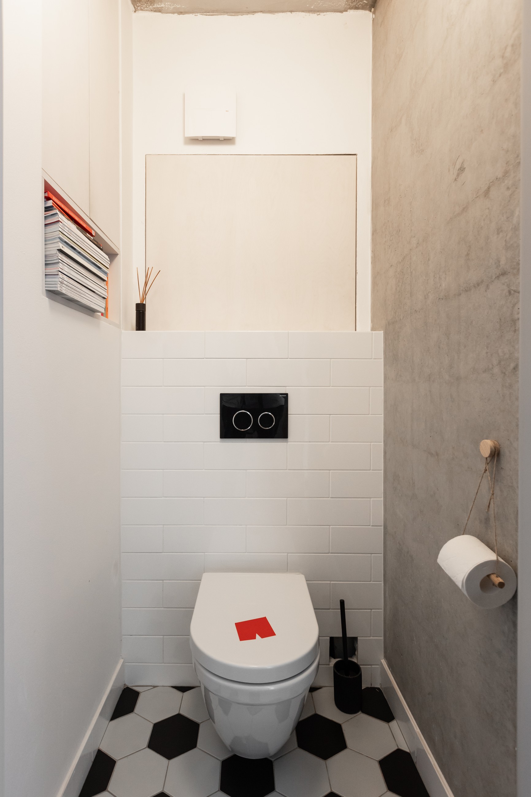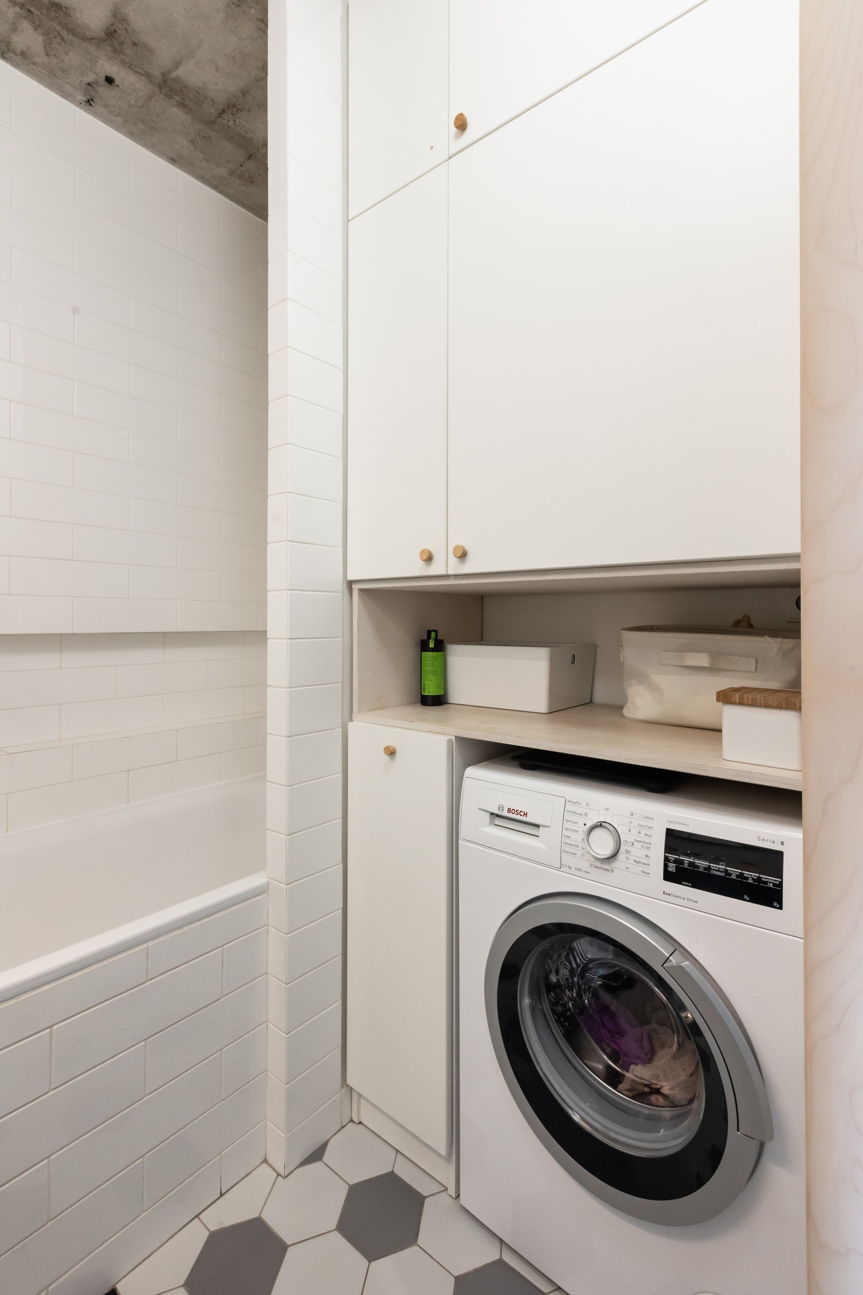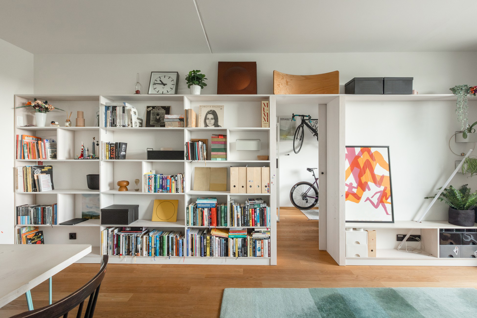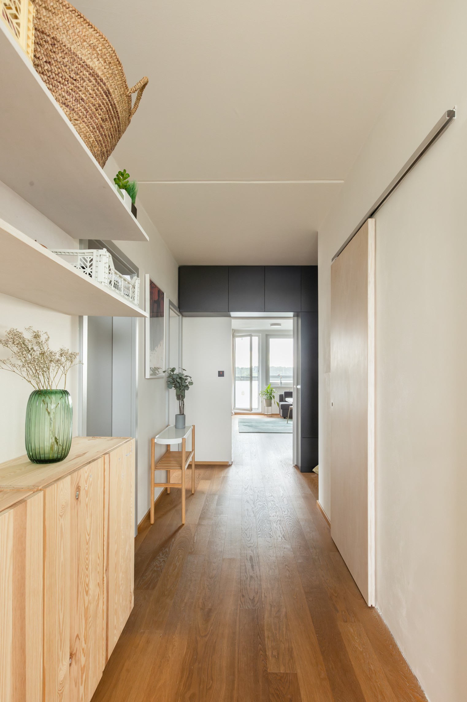 Hlavní pozornost byla věnována práci s materiály – třívrstvé dřevěné podlaha, bělená překližka, odhalený betonový strop, nové omítky a žádné podhledy. Návrh se zaměřil na maximalizaci úložných prostor v kuchyni, chodbě, koupelně i pokojích, aby byl každý centimetr využit co nejefektivněji.