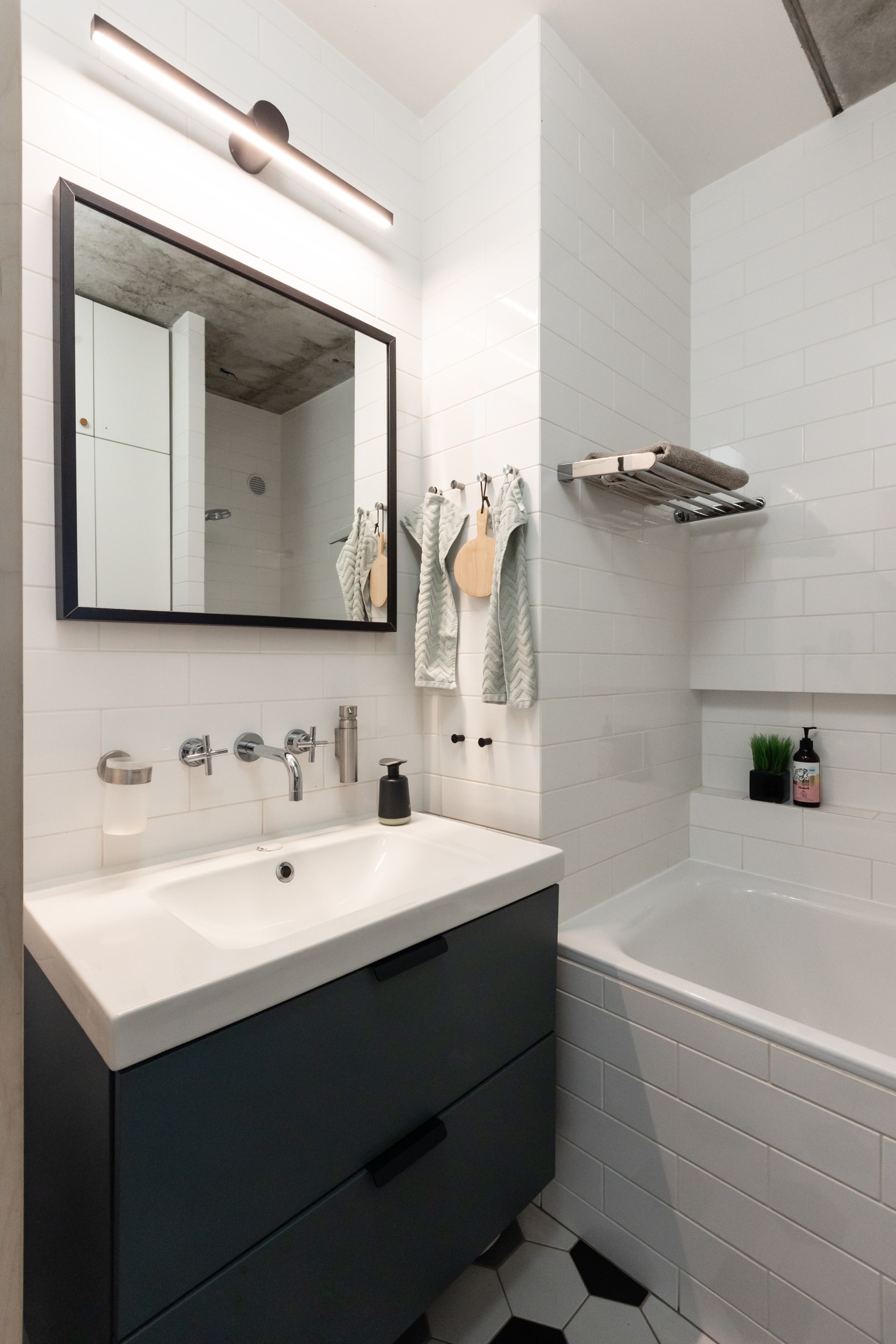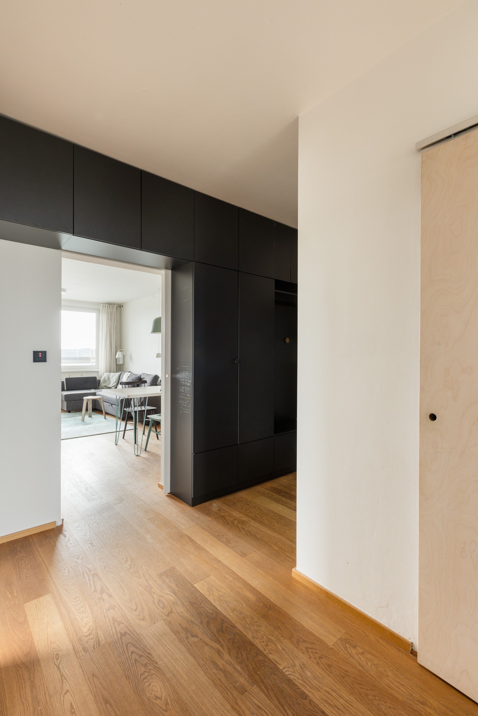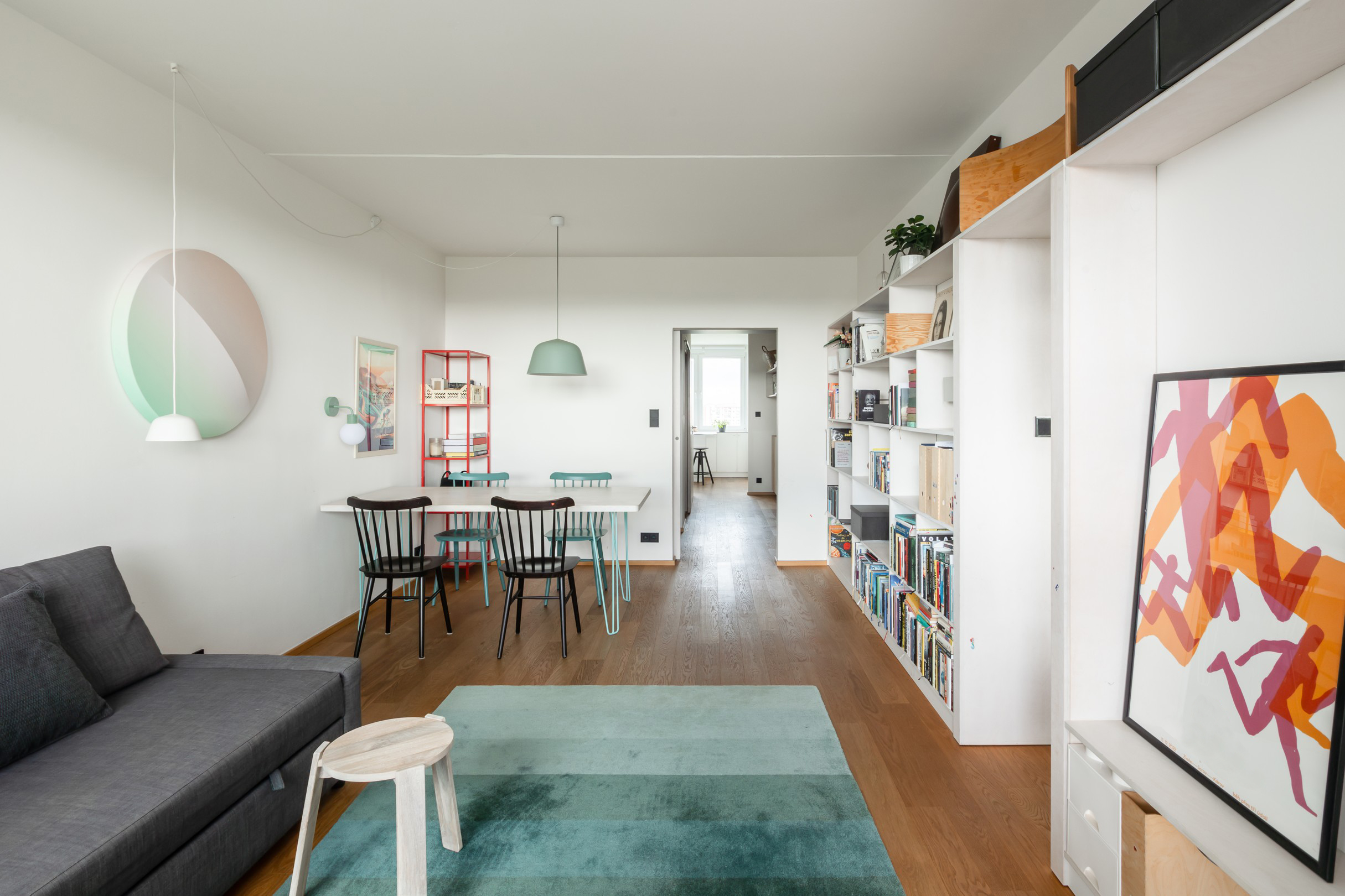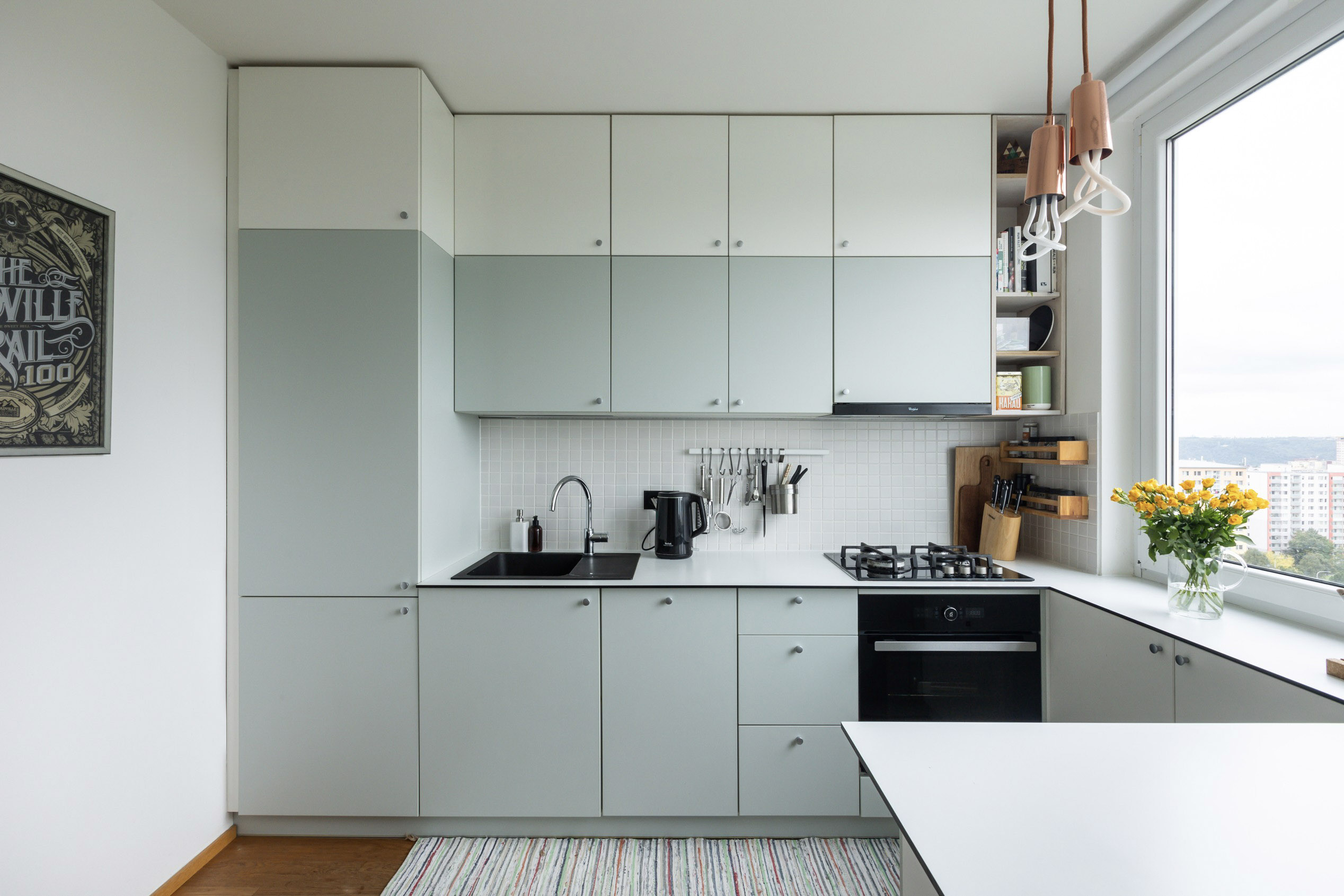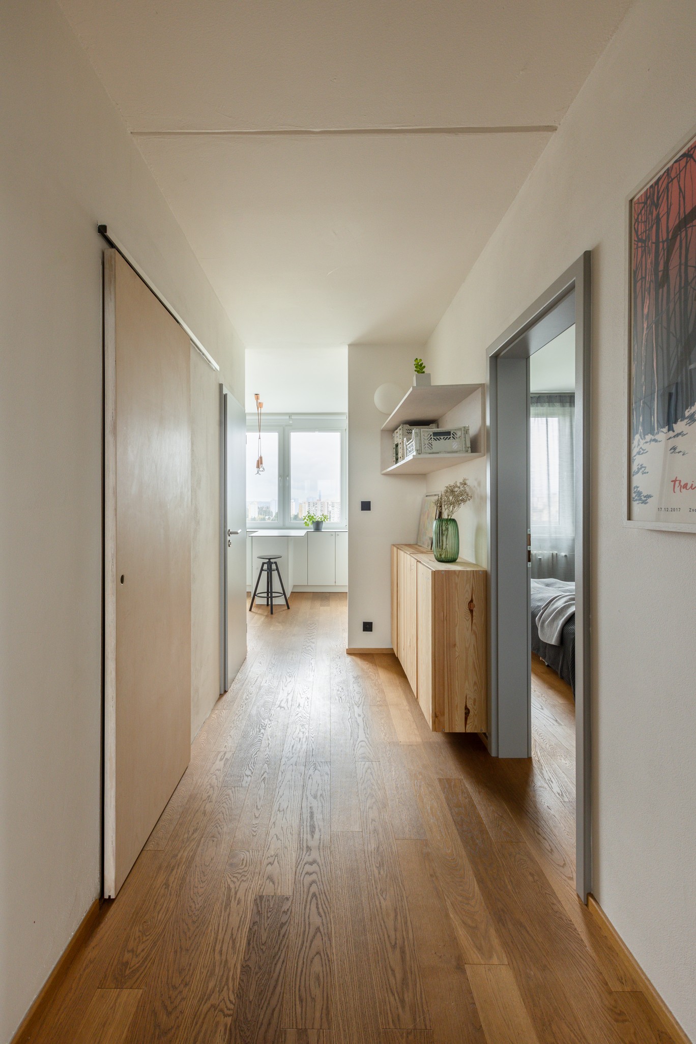 Díky citlivé kombinaci materiálů a promyšlenému řešení detailů se z původního panelového bytu stalo útulné a harmonické místo, kde je radost žít.