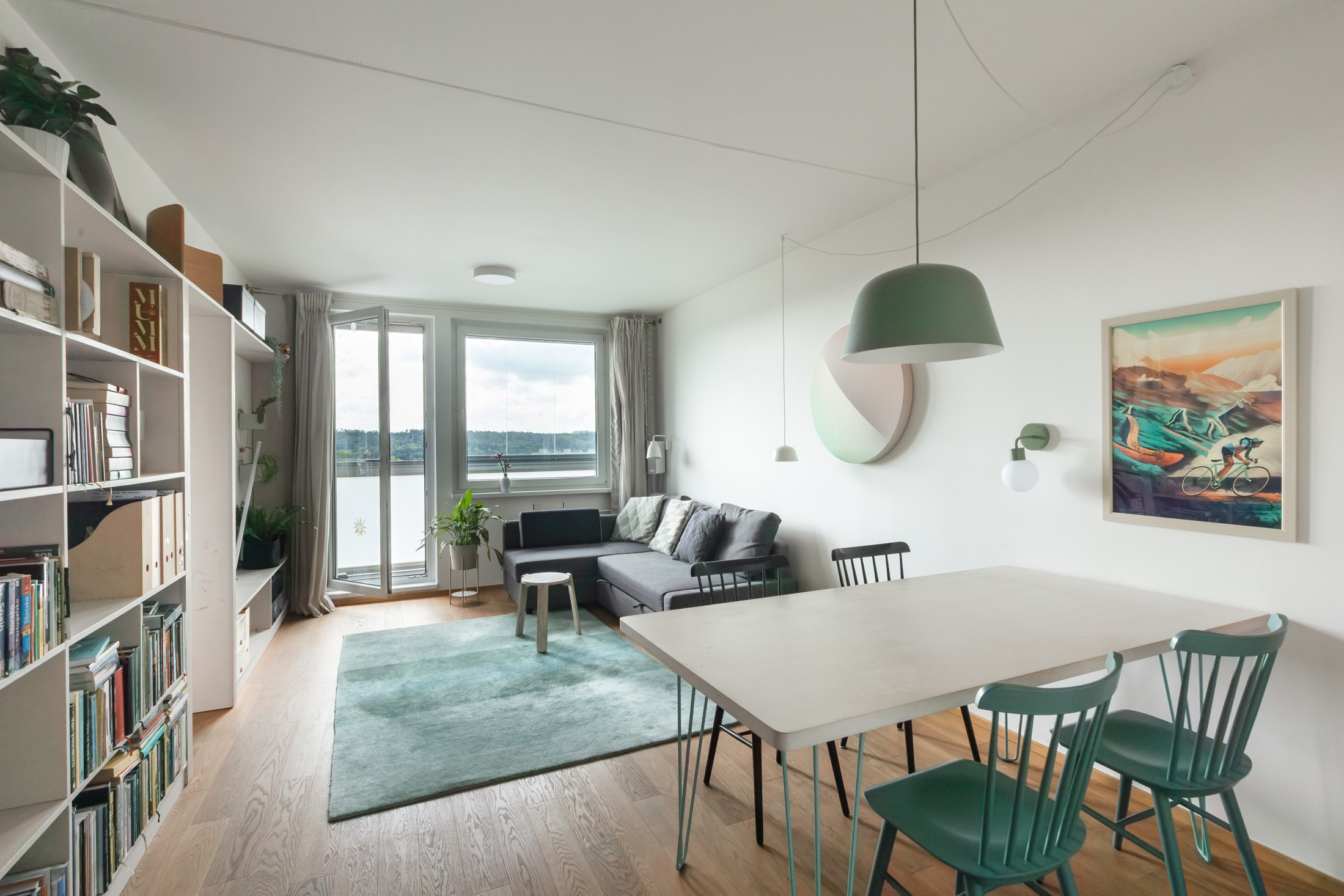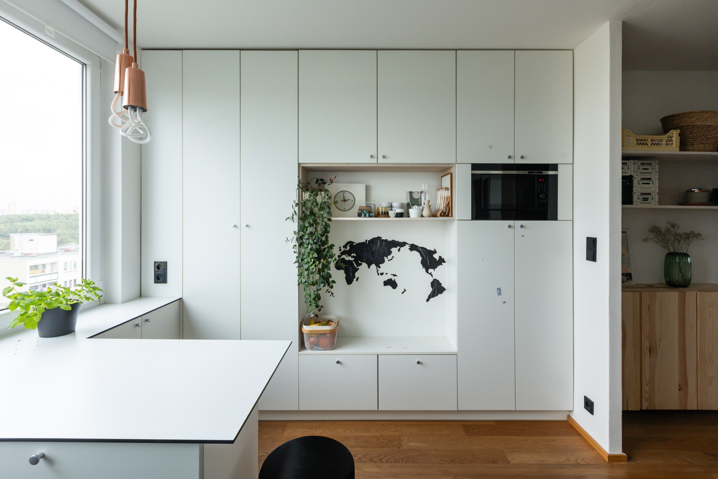 Byt v osmém nadzemním podlaží panelového domu s umakartovým jádrem, tapetami a koberci nabízel luxusní výhledy do zeleně, ale potřeboval refresh pro současné bydlení. Vzhledem ke statickému schématu objektu nebylo možné provádět výraznější zásahy do dispozičního řešení. Stavební úpravy proto zahrnovaly především kompletní rekonstrukci včetně výměny zdravotechniky a elektroinstalací.