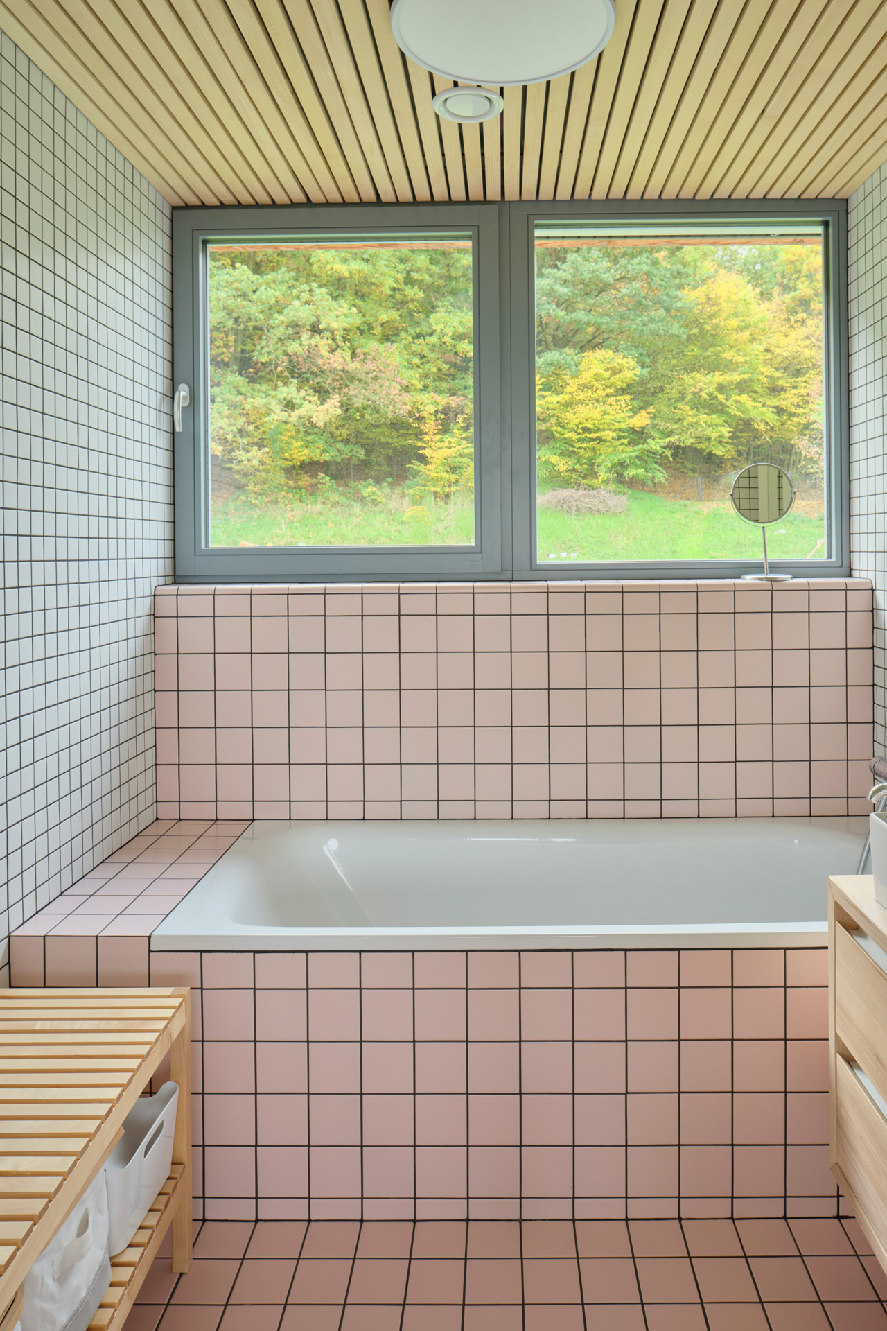 V koupelnách jsme si opět dovolili barevný experiment. Světle růžový a bílý obklad v kombinaci s tmavě šedou spárou vytváří jemnou grafickou strukturu, která prostoru dodává charakter a hloubku. Precizní kladení obkladů sice trochu potrápilo obkladače, výsledkem je ale koupelna, která působí svěže, hravě a přitom nadčasově.