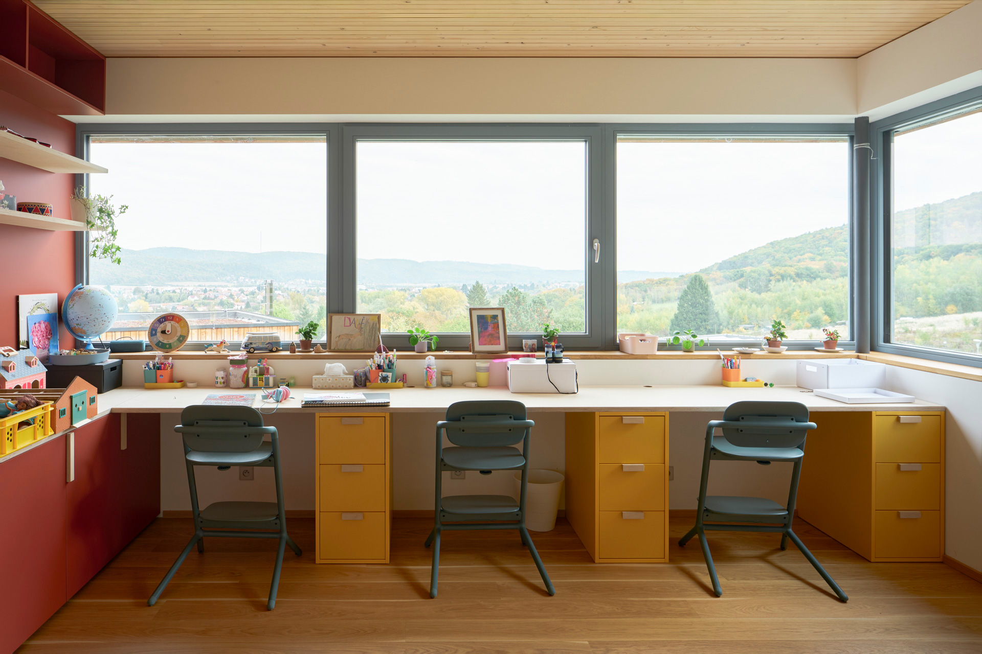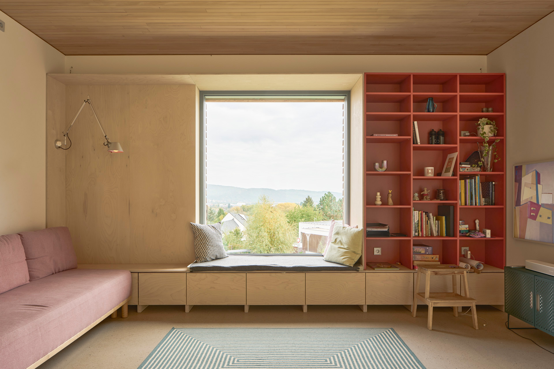 Barevnost a hravost se promítá i do dalších částí domu. Vestavěná knihovny se sedací nikou využívají každý centimetr prostoru a zároveň podporují kontakt s výhledem do krajiny.