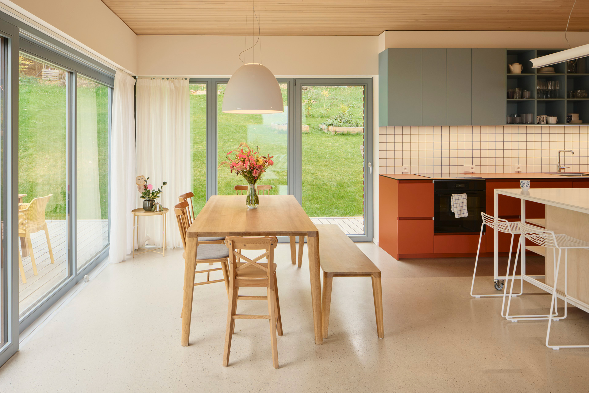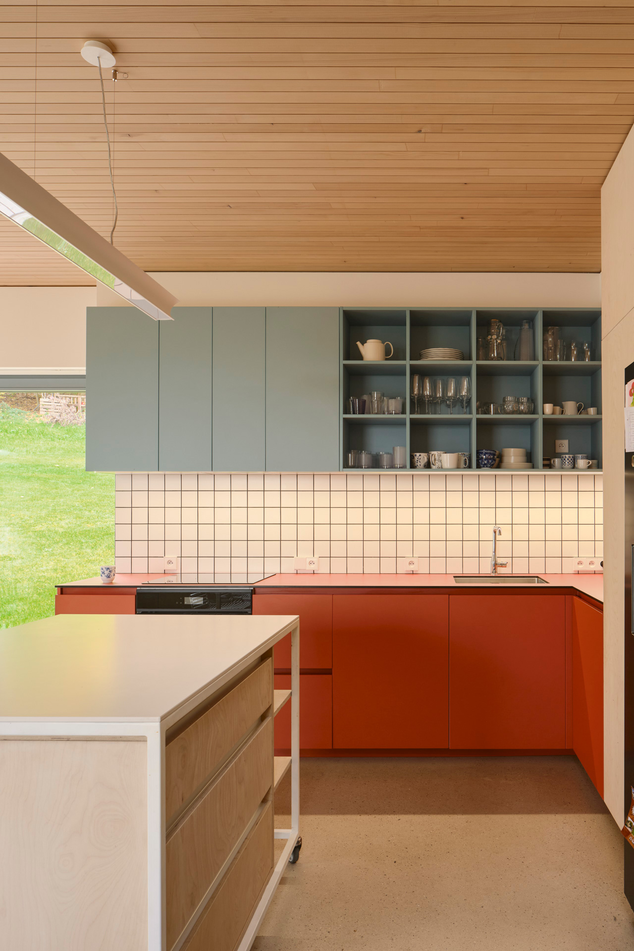 Srdcem domu je kuchyně s pojízdným ostrůvkem, který funguje nejen jako pracovní plocha, ale i jako hravý a variabilní prvek prostoru. Díky velkoformátovým posuvným oknům lze ostrůvek doslova „vyvézt“ až na venkovní terasu, čímž se interiér plynule rozšiřuje do exteriéru a podporuje neformální způsob života rodiny. Klienti se nebáli práce s barvou – výrazná cihlově červená se objevuje na pracovní desce i čelech spodních skříněk, zatímco horní skříňky v jemné holubí modři prostor opticky odlehčují. Ostatní nábytkové prvky jsou vyrobeny z březové překližky, jejíž kresba dodává interiéru přirozenost a řemeslnou kvalitu.